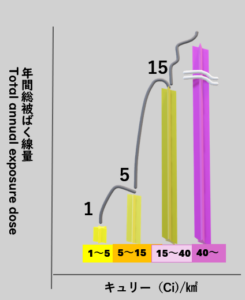 さて、とてもややこしくなってきたので、いったん、チェルノブイリ法で使用してるキュリーの区分と、現在の私たちが使用してる年間総被ばく線量のおおまかな関係を図にしていました。