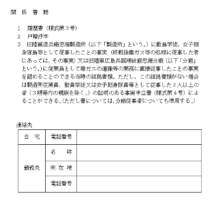 毒ガス工場での証拠書類がない場合は、「忠海製造所又は忠海分廠の従業員(工員等),動員学徒,女子挺身隊員,勤労奉仕隊員,引率教員,戦後処理従事者等として従事した二人以上の方(3親等以内の親族を除く。)の証明が必要とされます。
