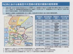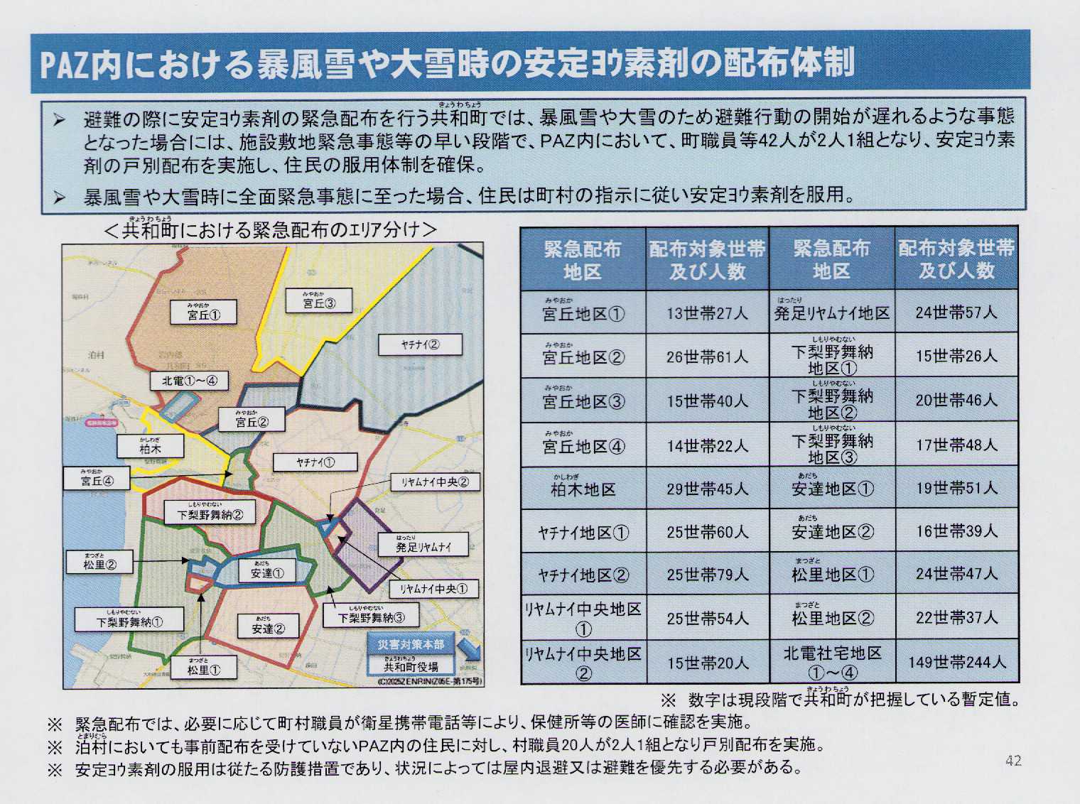 この計画P42には、「PAZ内における防風雪や大雪時の安定ヨウ素剤の配布体制」とあります。