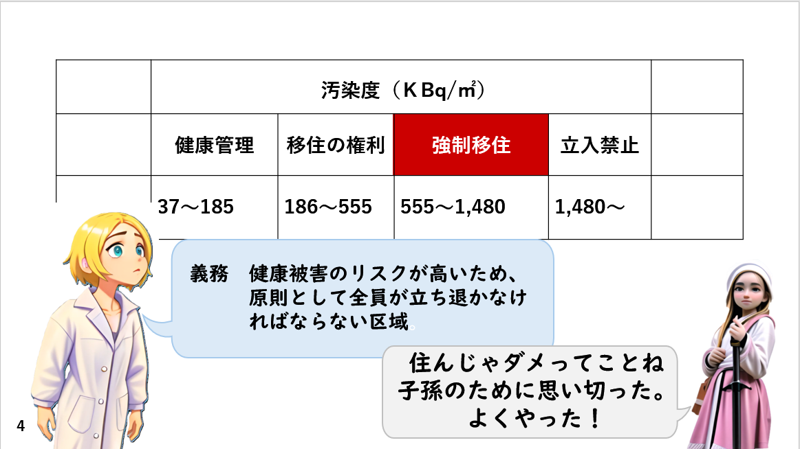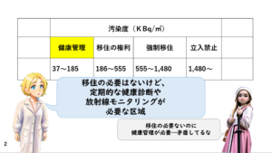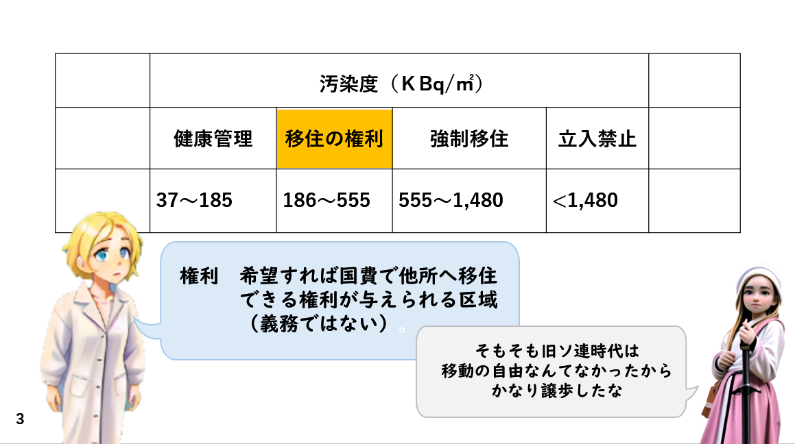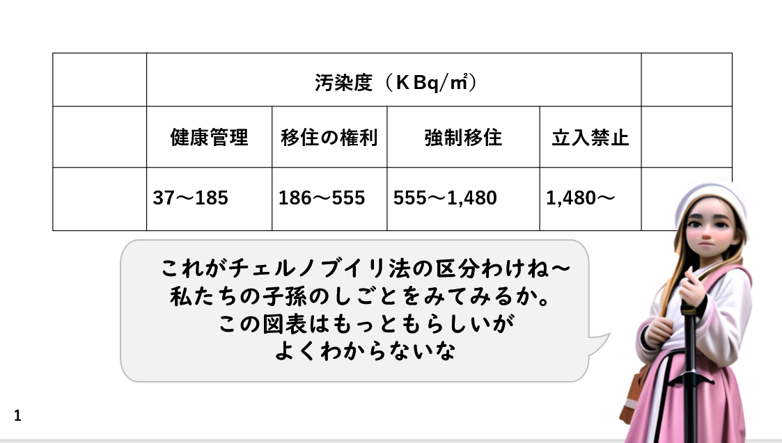 今回の紙芝居で、ご紹介したように、チェルノブイリ法では、この区分けにしたがって、救済法(福祉法)が用意されているからです。