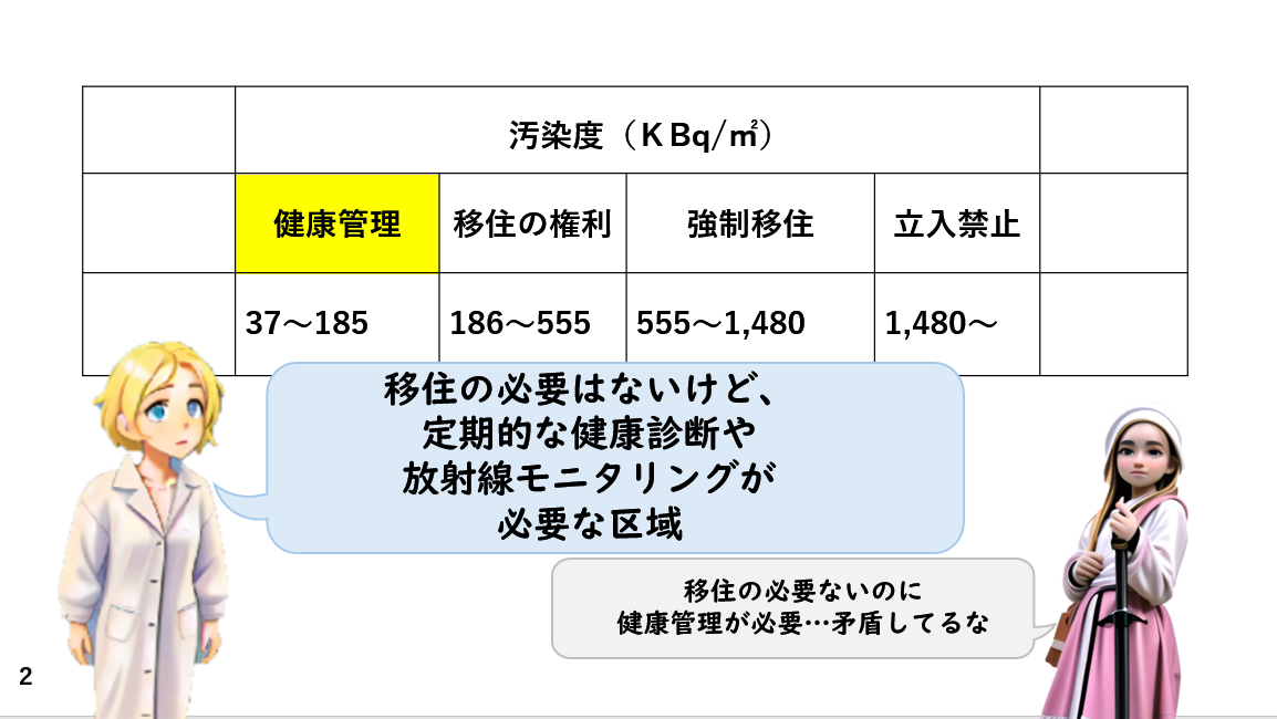 チェルノブイリよりはるかに高い汚染地に人々が残留居住をさせられてるのに、あるいは還流居住させられてるのに健康被害が一人もいないという。