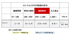しかも、わかりやすい Bq/kgでいえば、なんとなんと、立ち入り禁止区域である場所は日本でたくさんあるということがわかると思います。