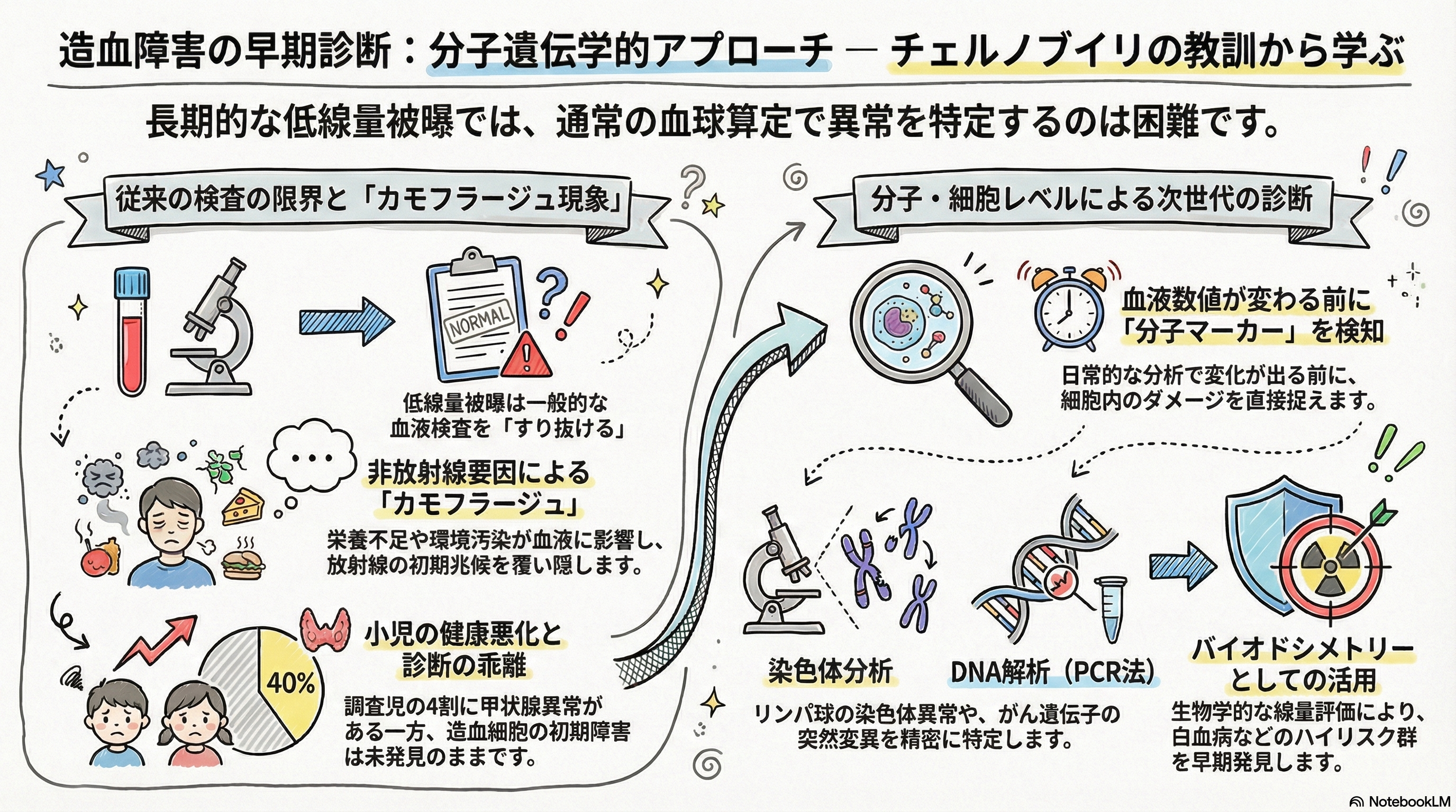 急性被曝の場合、造血組織への影響は一般的な血液検査で明確に表れますが、低線量での長期被曝の場合、日常的な血液検査で異常を早期に捉えることは困難です。実際に被災地の子どもたち2200人を対象とした調査でも、ビタミン欠乏や大気汚染など他の要因が影響を「カモフラージュ」してしまい、従来の臨床検査は放射線誘発性の障害の早期診断には不十分であることが判明しました。