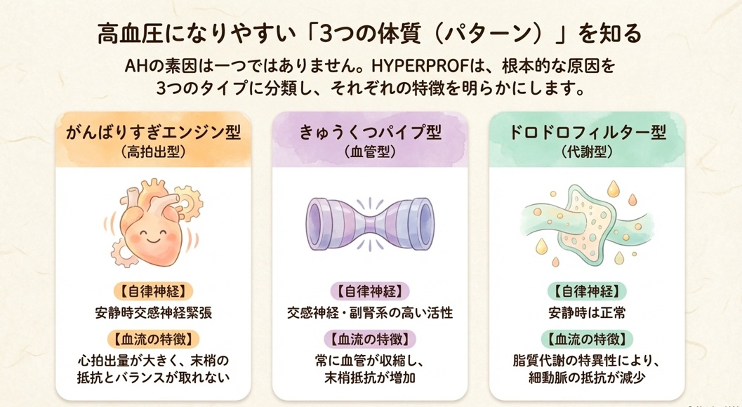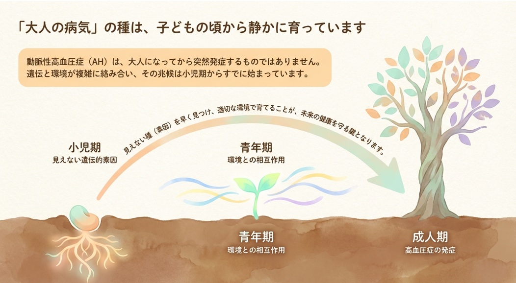 結論: 素因を「高拍出型」「血管型」「代謝型」の3つに分類することで、小児や成人発症前の段階における高血圧の個別予後予測と、一人ひとりに合わせた一次予防策の立案が可能になります 。