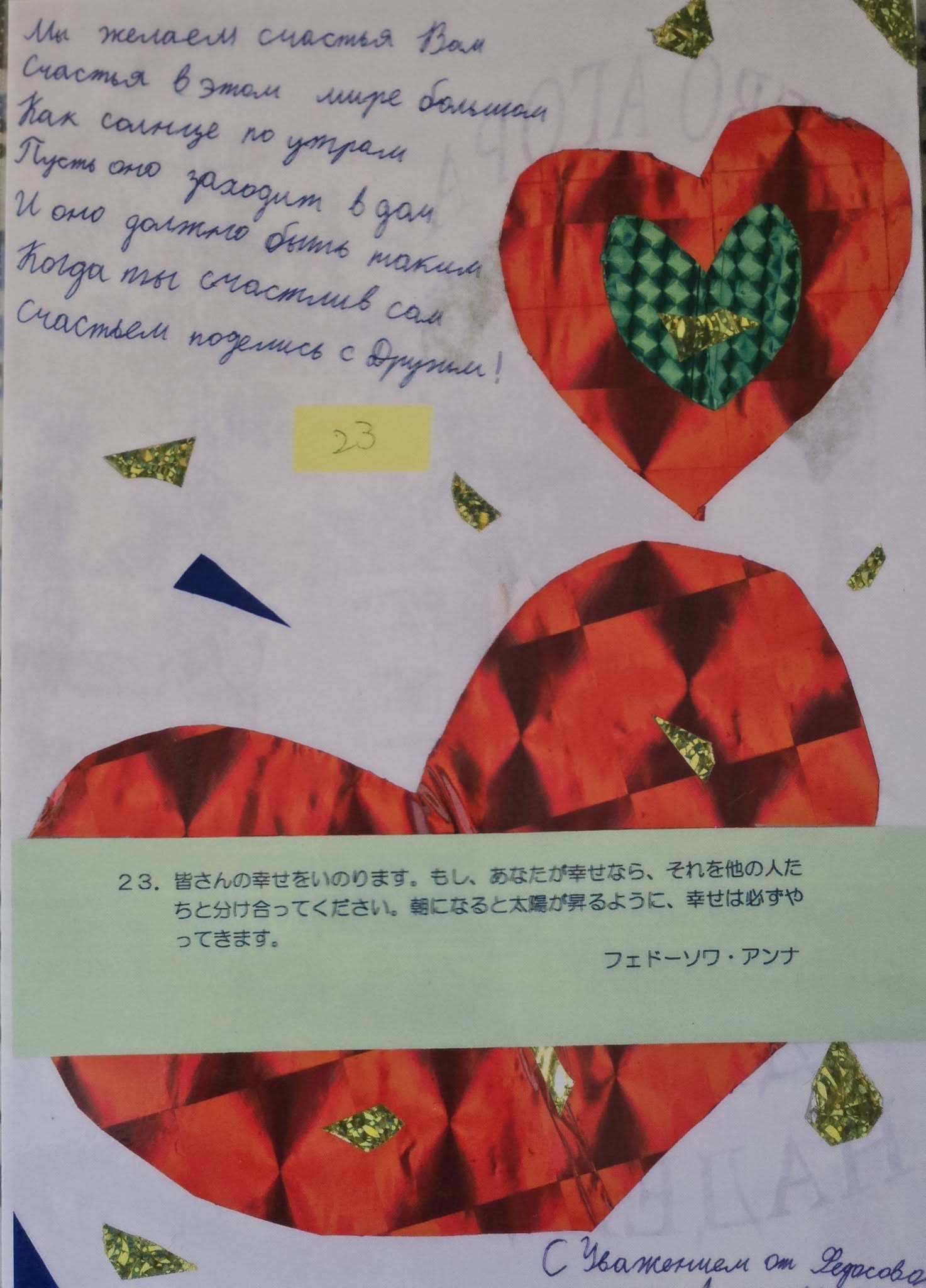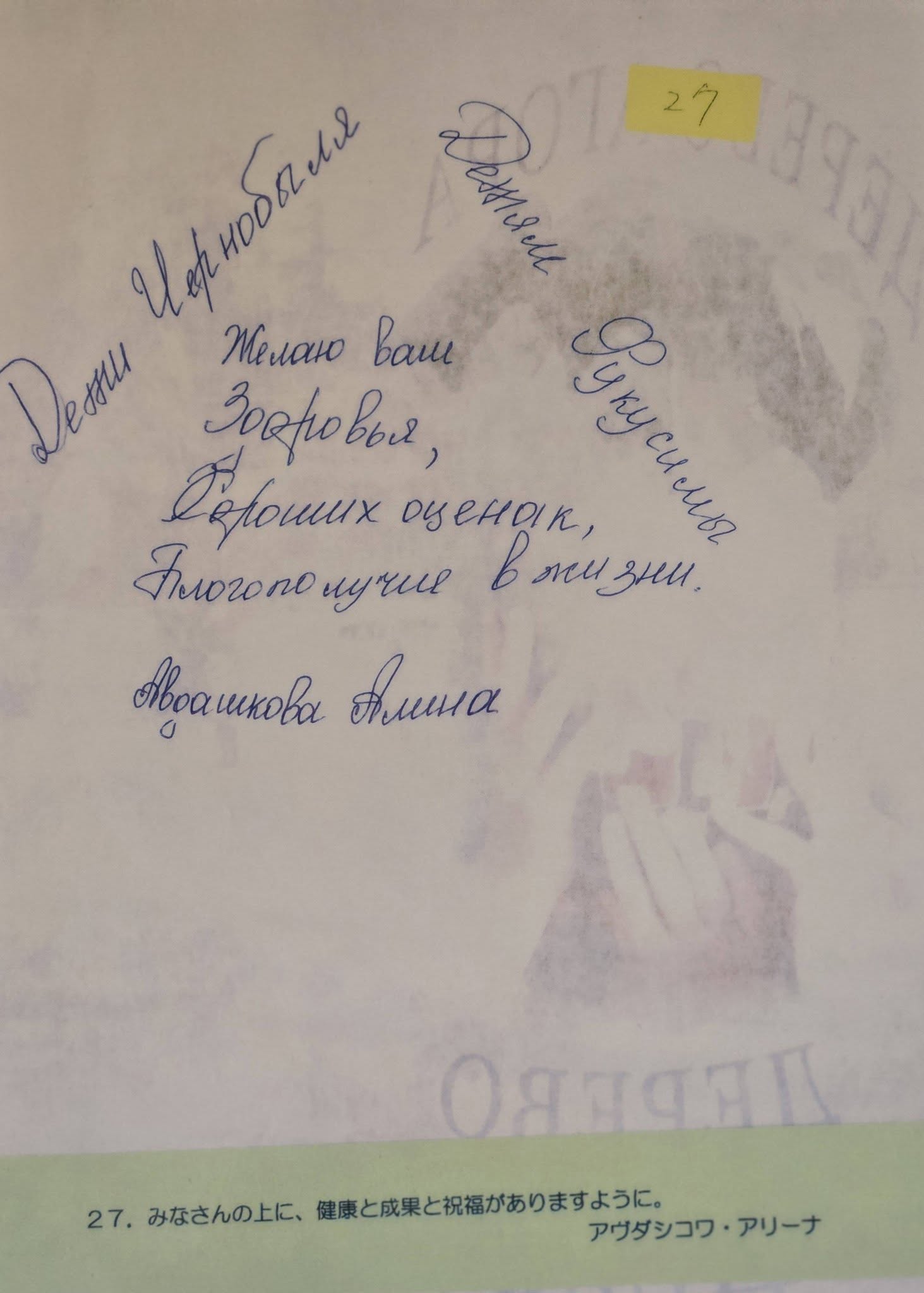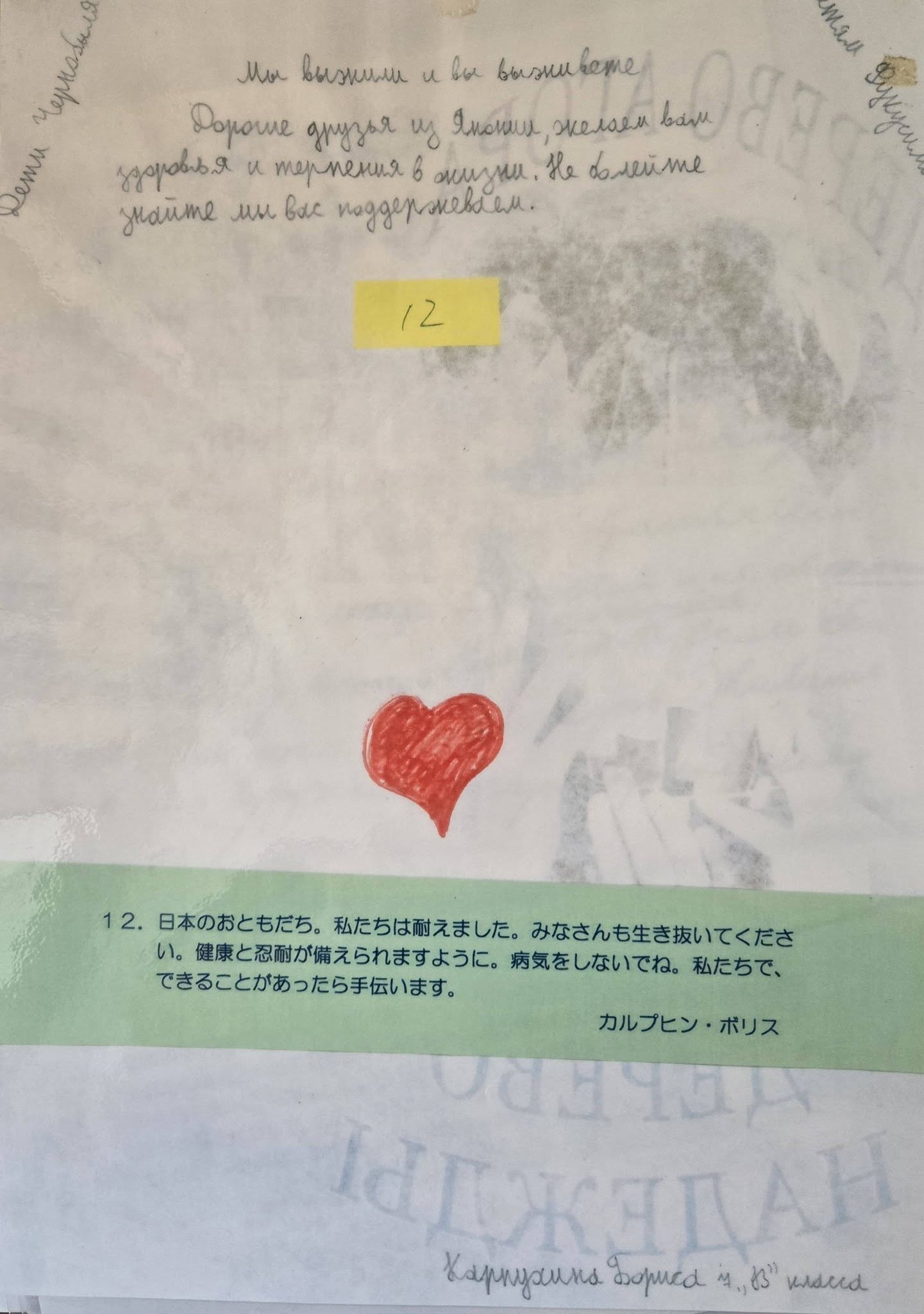 日本のお友達、私たちは耐えました。みなさんも生き抜いてくださいね。健康と忍耐が供えられますように。病気をしないでね。私たちでできることがあったら手伝います。