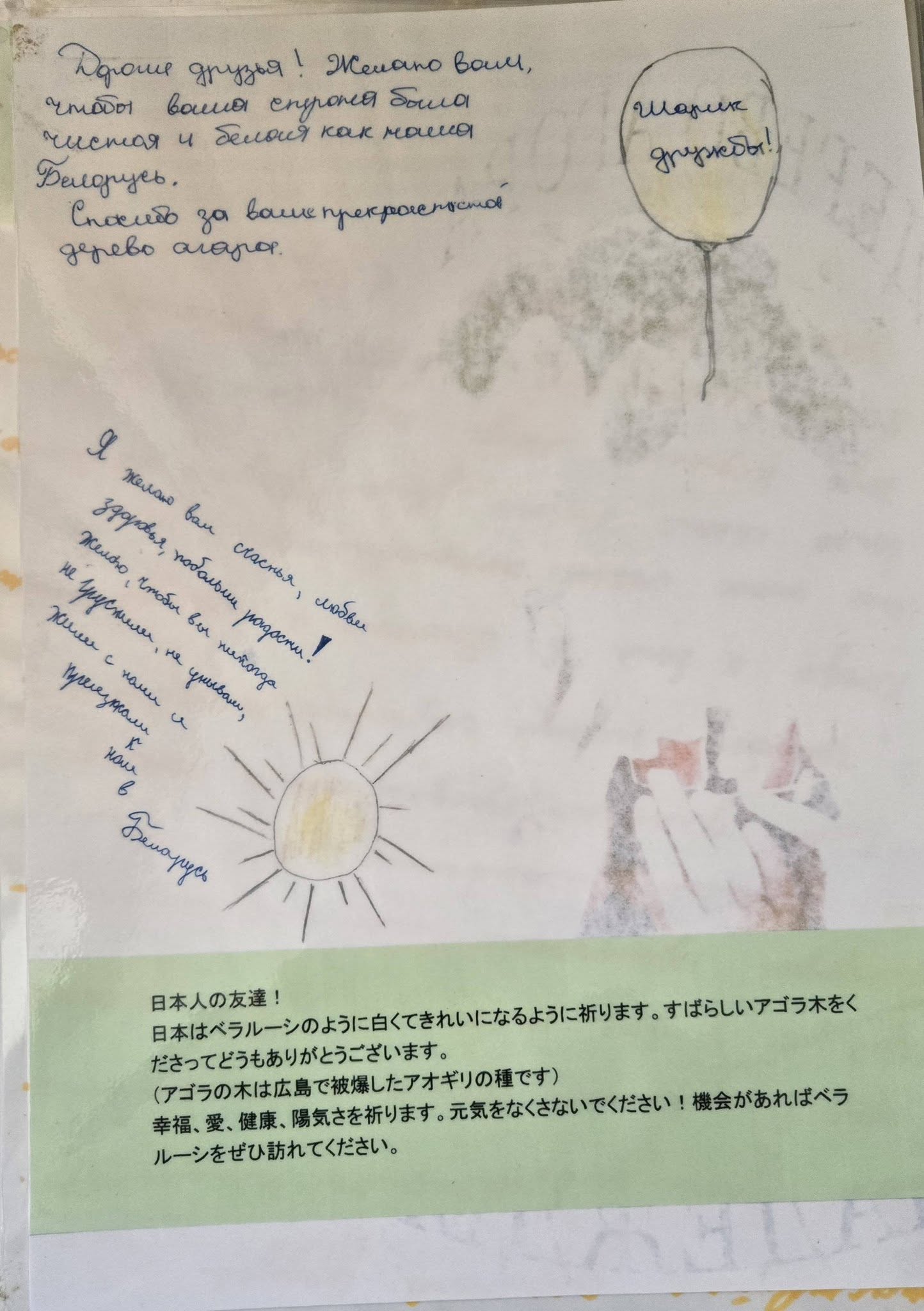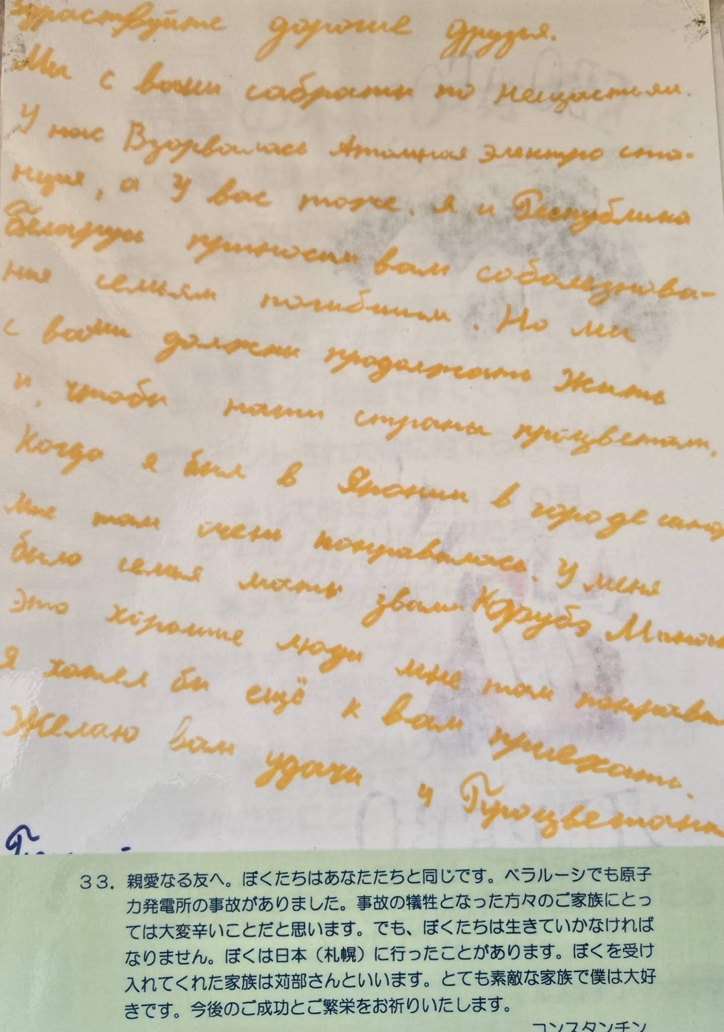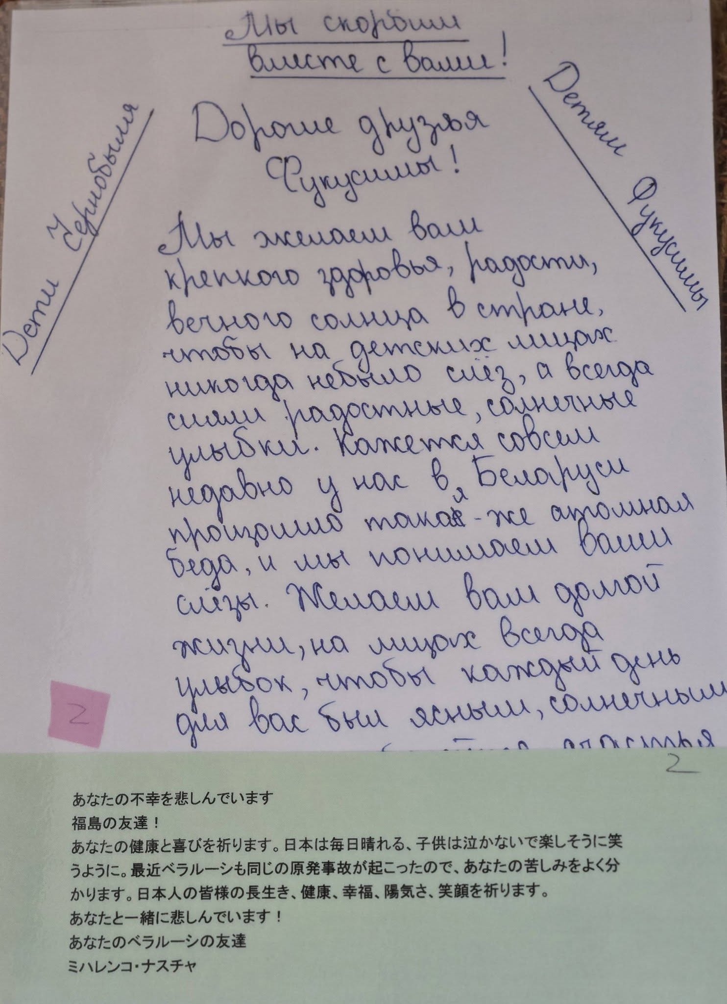 ベラルーシでも原子力発電所の事故がありました。事故の犠牲となったかたがたのご家族にとって大変つらいことだと思います。でも、ぼくたちは生きていかなければなりません。ぼくは日本(札幌)に行ったことがあります。僕を受け入れてくれた家族は苅部さんといいます。とても素敵な家族でぼくは大好きです。